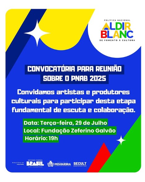 Na próxima terça-feira (29/07), às 19h, a Fundação de Cultura abre as portas para mais uma reunião participativa, desta vez, com artistas e produtores culturais.