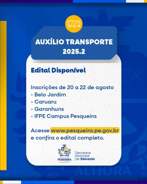 Estudantes pesqueirenses, fiquem atentos aos prazos para inscrição no auxílio transporte estudantil 2025.2.