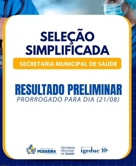 O resultado preliminar da Seleção Simplificada da Saúde, com o objetivo de contratar profissionais de várias áreas será divulgado até o dia 21 de agosto.