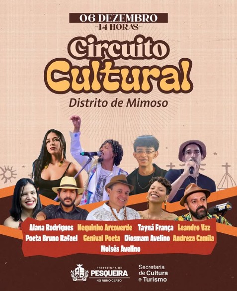 No dia 06 de dezembro, a partir das 14h, acontece mais uma edição do Circuito Cultural, reunindo artistas, poetas e músicos da nossa terra em uma tarde cheia de arte, memória e tradição.