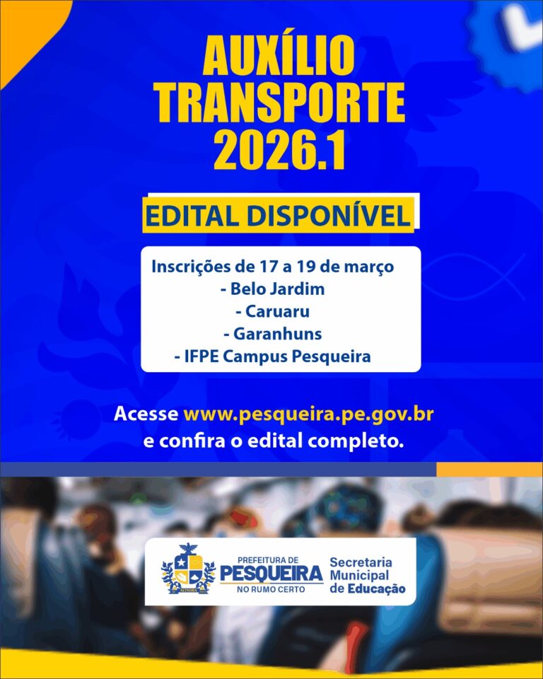 Estudantes de Pesqueira que precisam se deslocar para estudar em outras cidades já podem se preparar: a Prefeitura abriu o período de inscrições para o Programa Auxílio Transporte Estudantil 2026.1, iniciativa que busca garantir apoio financeiro para alunos em situação de vulnerabilidade socioeconômica.