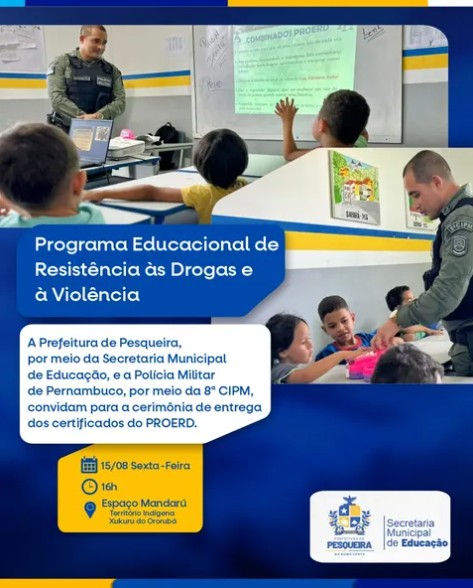 Nesta sexta-feira, 15 de agosto, o município de Pesqueira, no Agreste vai realizar a entrega dos certificados de participação no PROERD aos alunos da Escola Municipal Professor Potiguar Matos e da Escola Intermediária Indígena Monsenhor Olímpio Torres em um momento que celebra a parceria entre a Prefeitura de Pesqueira e a Polícia Militar de Pernambuco.