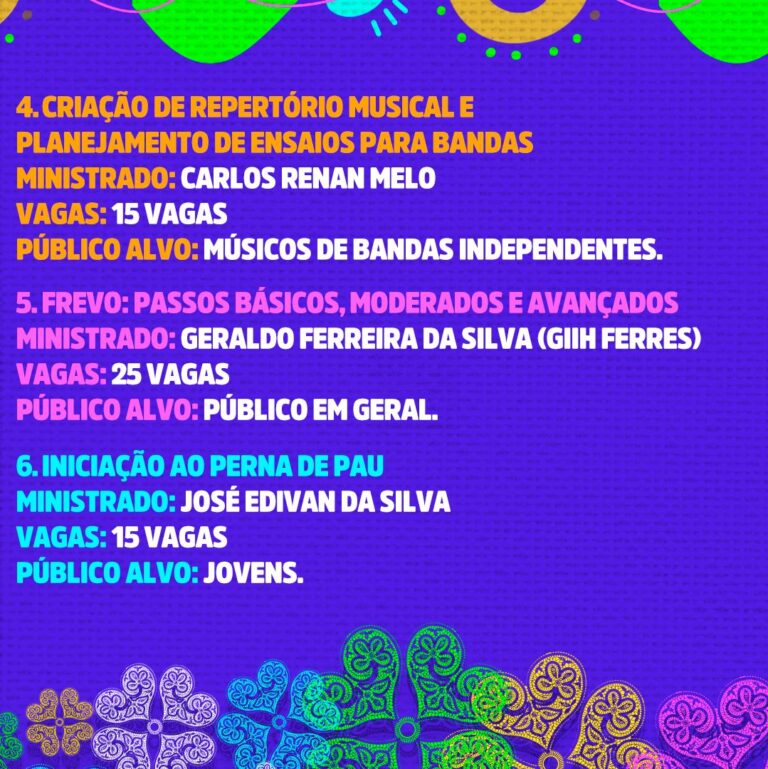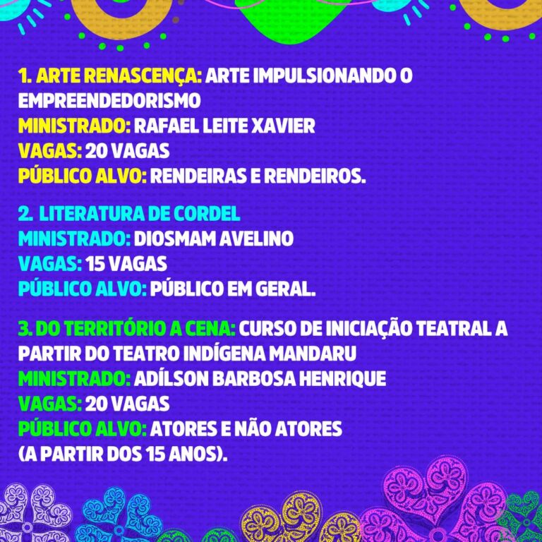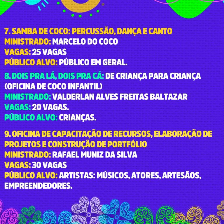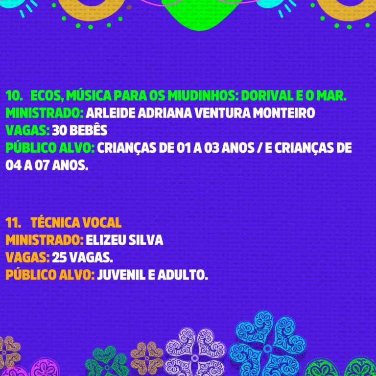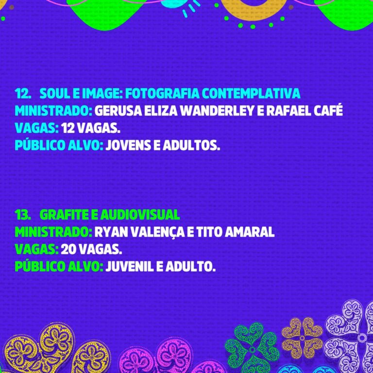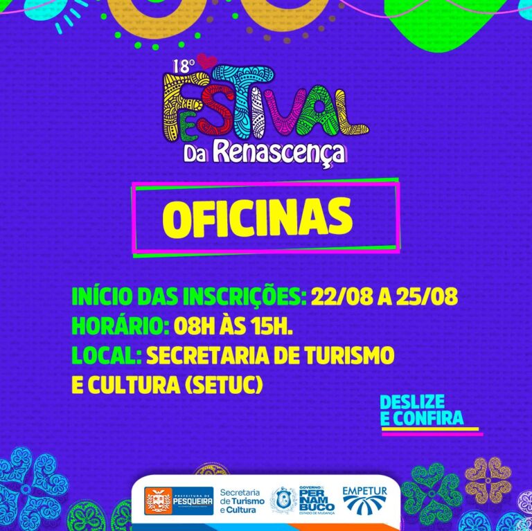 Quer aprender algo novo e se conectar com a cultura? Não perca a oportunidade de participar das nossas oficinas incríveis nos dias 28 a 31/08. Venha desenvolver habilidades, trocar experiências e se divertir!
