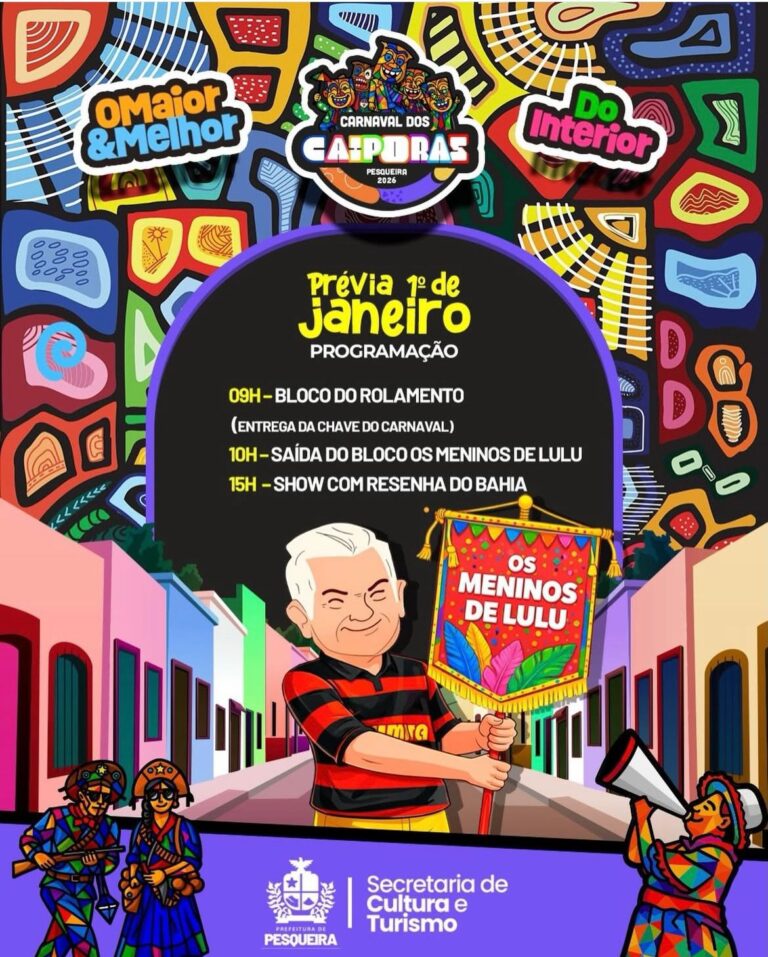 Pesqueira abre oficialmente o calendário festivo de 2026 com a realização da 1ª Prévia do Maior e Melhor Carnaval do Interior, no dia 1º de janeiro, no bairro do Prado. O evento antecipa a energia do Carnaval dos Caiporas e reúne música, tradição e muita animação logo no primeiro dia do ano.