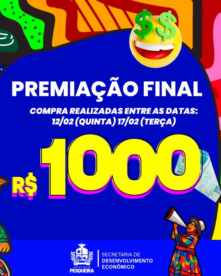 A premiação final contemplará os foliões que realizarem compras entre 12 e 17 de fevereiro, quando será sorteado o valor de R$ 1.000,00 em dinheiro. A iniciativa reforça o compromisso da gestão municipal com ações inovadoras que geram impacto direto na economia e no cotidiano da população.