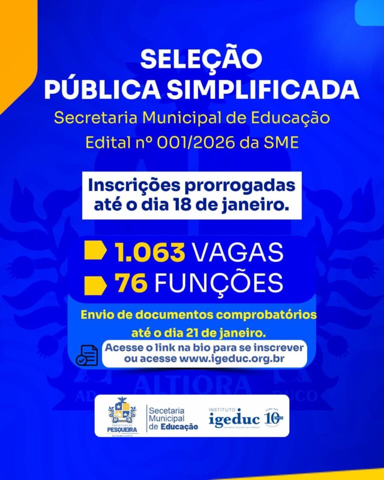 A Seleção Pública Simplificada da Secretaria de Educação de Pesqueira – Edital nº 001/2026 teve o prazo de inscrições prorrogado até o dia 18 de janeiro.