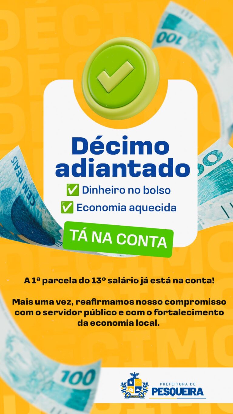 A Prefeitura de Pesqueira anunciou o pagamento antecipado da primeira parcela do 13º salário dos servidores municipais. O valor, que será depositado na próxima quarta-feira, 11 de junho, representa um investimento de R$ 2,5 milhões, que devem aquecer a economia local, especialmente o comércio.